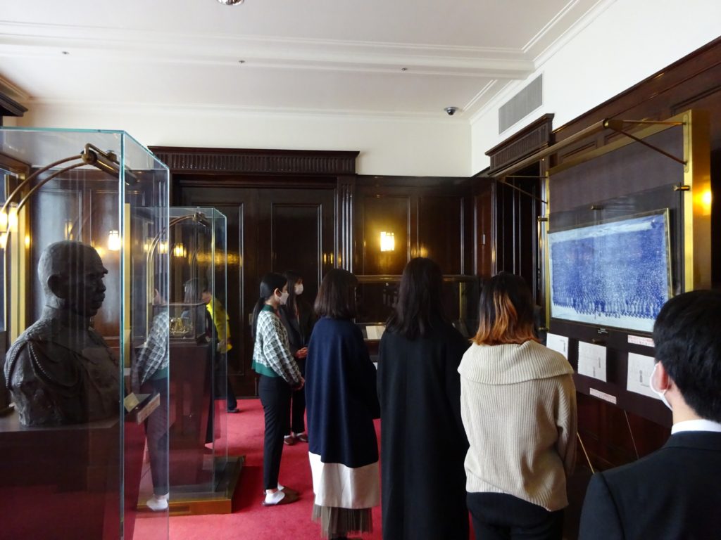 まずは庁舎や極東国際軍事裁判(東京裁判)の法廷となった大講堂などを移設・復元した市ヶ谷記念館を見学。防衛省市ヶ谷地区にまつわる歴史を映像で視聴したり、東京裁判に関わる貴重な資料も見せていただき、歴史を感じる時間となりました。