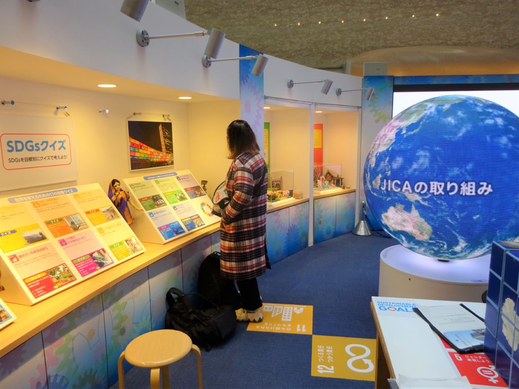 施設内にある「J‘sカフェ」では珍しい国の料理を堪能することができ、食を通じて早速グローバルを体験するID生たち。展示コーナーでは「SDGsのコト、本気で考える展」が開催されており、世界の人々の暮らしや世界が抱える課題、その課題への取り組みについて展示物やゲームなどを通じてSDGsの活動を知ることができました。SDGs達成に向けて自分にできる取り組みは無いかを考えるきっかけとなりました。