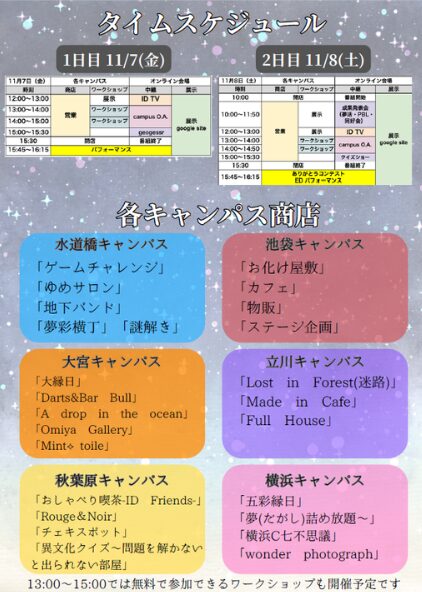 どなたでも大歓迎!各キャンパスで様々な催し物・出し物を行います!ぜひご参加ください~(事前予約不要)