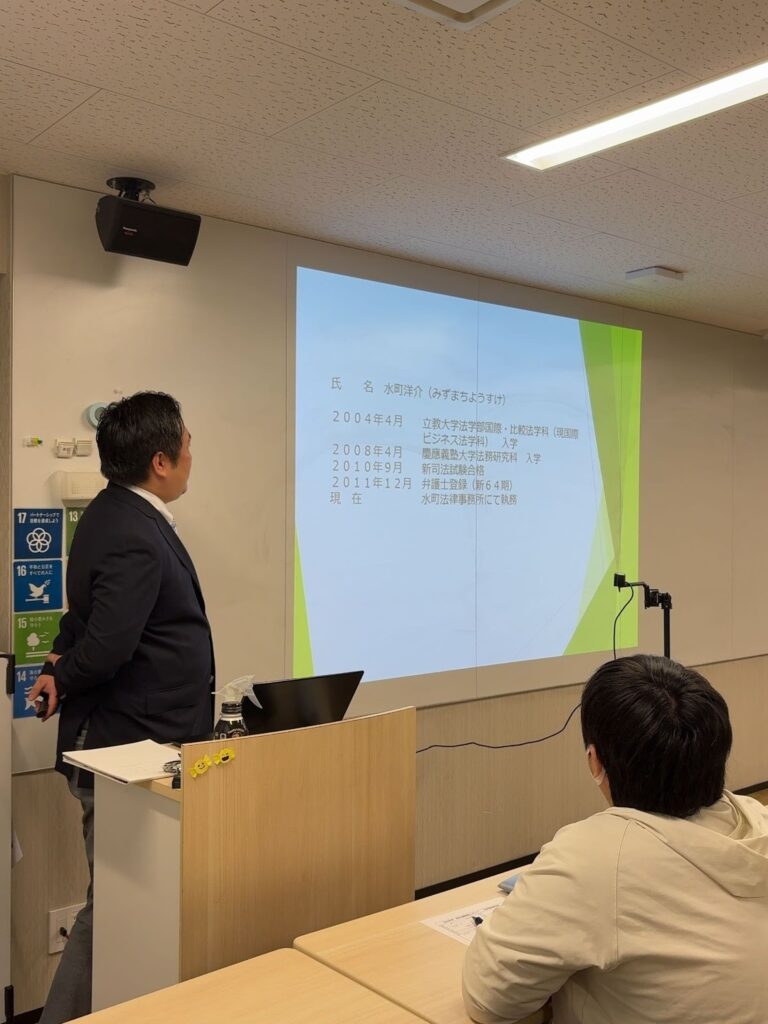 水道橋キャンパスでは、現役弁護士の水町洋介先生をお迎えし、法律業界についてをプロの視点からお話いただきました。