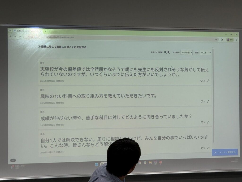 主な内容としては、生徒たちの質問に対して、大学生・大学院生の先輩が即興で回答するという