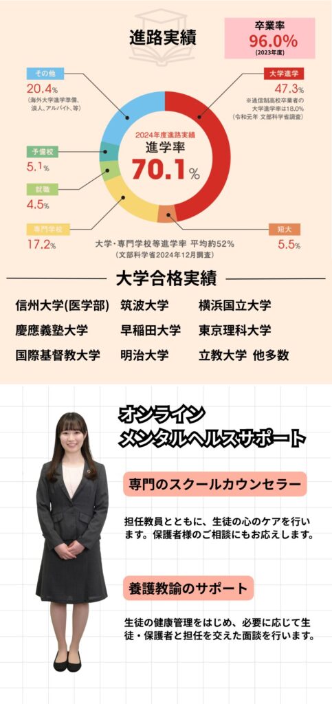 多くの生徒が大学・専門学校に進学しています。進学率は70.1%(2024年度)です。希望進路に応じた個別指導を実施しています。卒業率は、96.0%(2023年度)。
