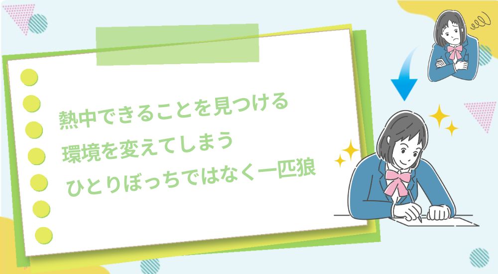 しかし、ひとりでいることにより学校生活を楽しめていない状況をしたいと感じているならば、前向きに改善したいものです。