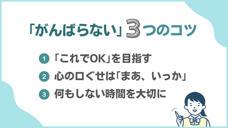 ここまで、『がんばらない』ためのコツや考え方を紹介してきました。