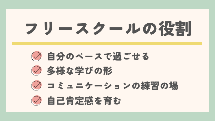 お子様の状況や目指すものによって、フリースクールの役割も柔軟に変わっていくのが特徴です。