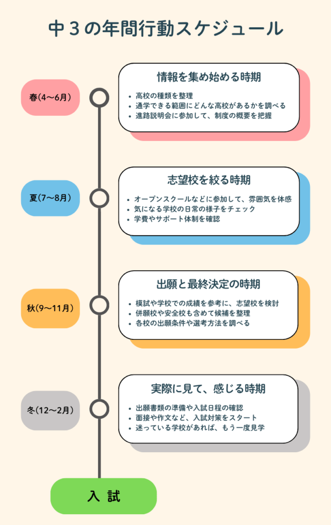 いきなり志望校を決めるのではなく、『知る→見に行く→考える→話し合う』という流れを意識して動くことで、高校選びがぐっと現実的になっていきます。