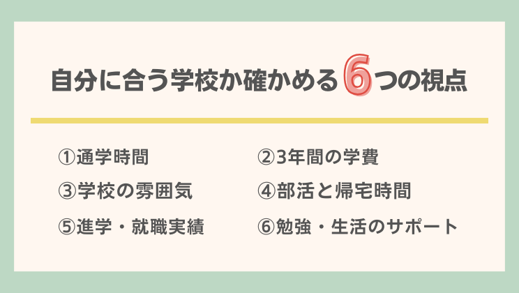 ③ 通学時間・学費・学校の雰囲気など、6つの視点で『自分に合うか』を見極める