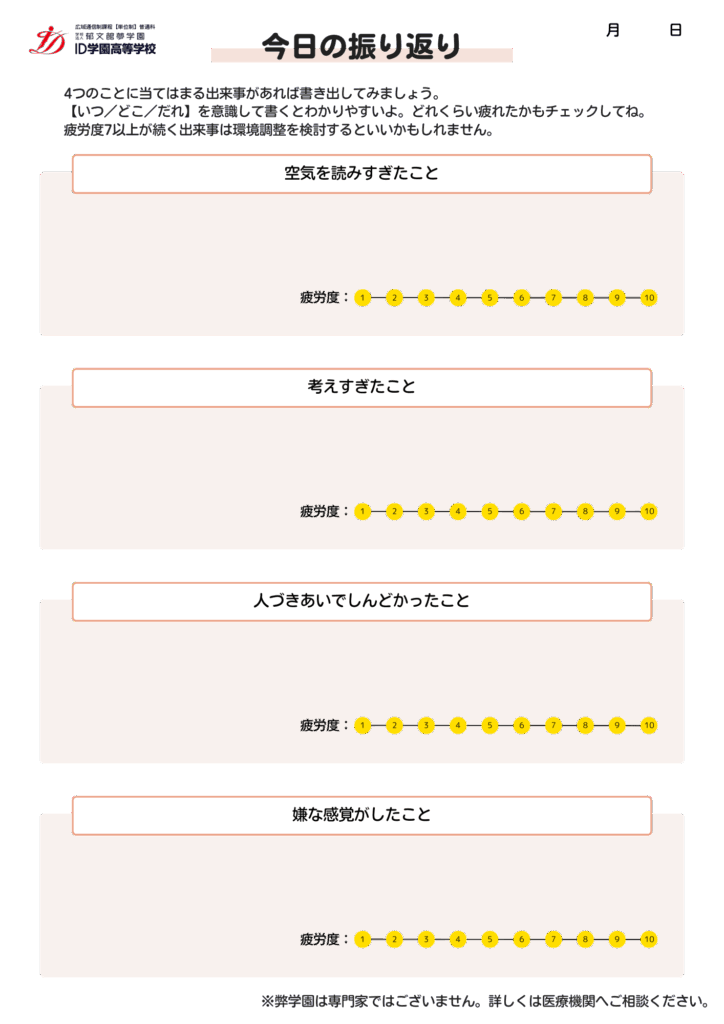 ④ 嫌な感覚がしたこと『いつ・どこ・誰』という情報も一緒に書くことで、疲れやすい場面やパターンが見えてくるかもしれません。