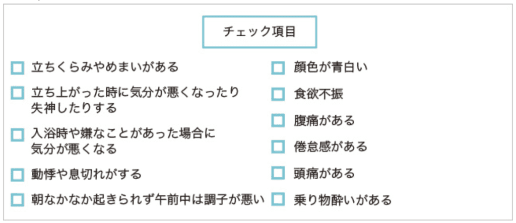 社会福祉法人 恩賜財団済生会のホームページによると、次のチェック項目の3つ以上に該当した場合で他の病気ではないと思われる人は起立性調節障害の可能性があるとしています。