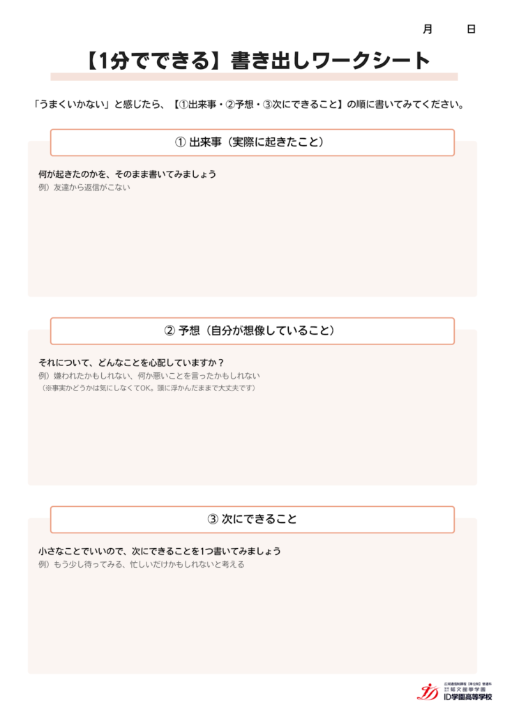 考えを文字にすると、「本当に起きたこと」と「自分の想像」が分かれて見えやすくなります。