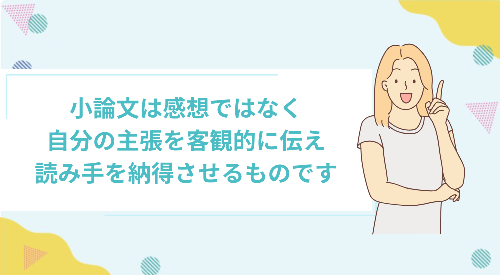 一方の小論文は、感想ではなく自分の主張を客観的に伝え、読み手を納得させるものです。