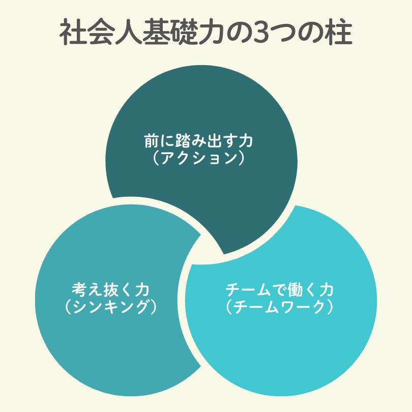 例えば、経済産業省が提唱する『社会人基礎力』という考え方があり、社会に出て働くうえで必要な基礎的な力を、次の3つに分けて示しています。